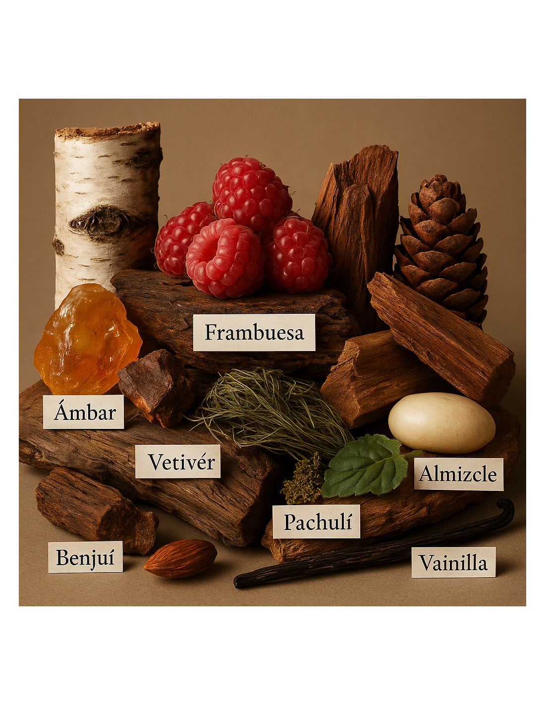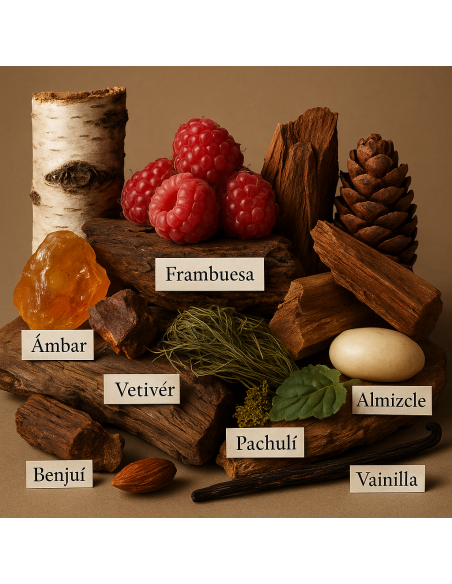A mesura que s’assenta, el mesc i el patchouli reforcen el seu fons terrós i fustós, mentre que la resina d’avet aporta un matís balsàmic i suaument resinós, equilibrant la composició sense tornar-la dolça.