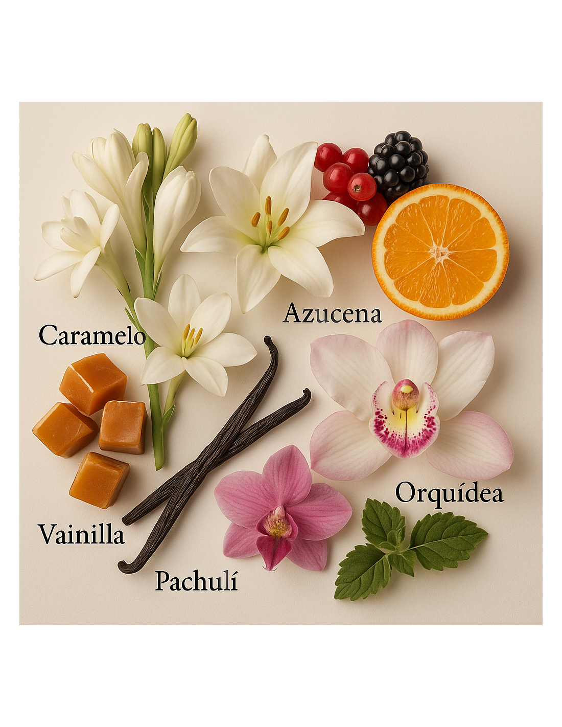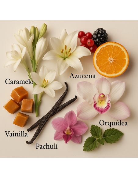 Finalment, la base és profundament càlida i sensual. El monoi (oli perfumat de flors) li dona una textura suau i cremosa, que combina perfectament amb la vainilla, afegint una dolçor reconfortant i envoltant. El patchouli contribueix amb una faceta terrosa i lleugerament amaderada.