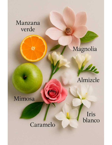 Una fragància multicolor que evoca la frescor de la brisa del matí en un camp de flors. El seu aroma fresc i juvenil recorda un ram de flors acabades de tallar, combinat amb la dolçor de fruites fresques.