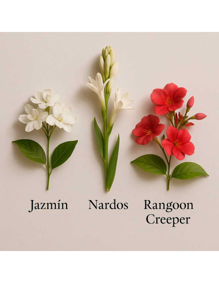 La seva creació combina extracte de tuberosa de l’Índia, essència de capes de gessamí i notes envoltants de madreselva. Al cor, un bouquet floral format per gessamí, flor del taronger i peònia aporta suavitat, elegància i una frescor radiant. Finalment, la fragància reposa sobre un fons subtil i càlid de arrel d’iris, sàndal i vainilla.