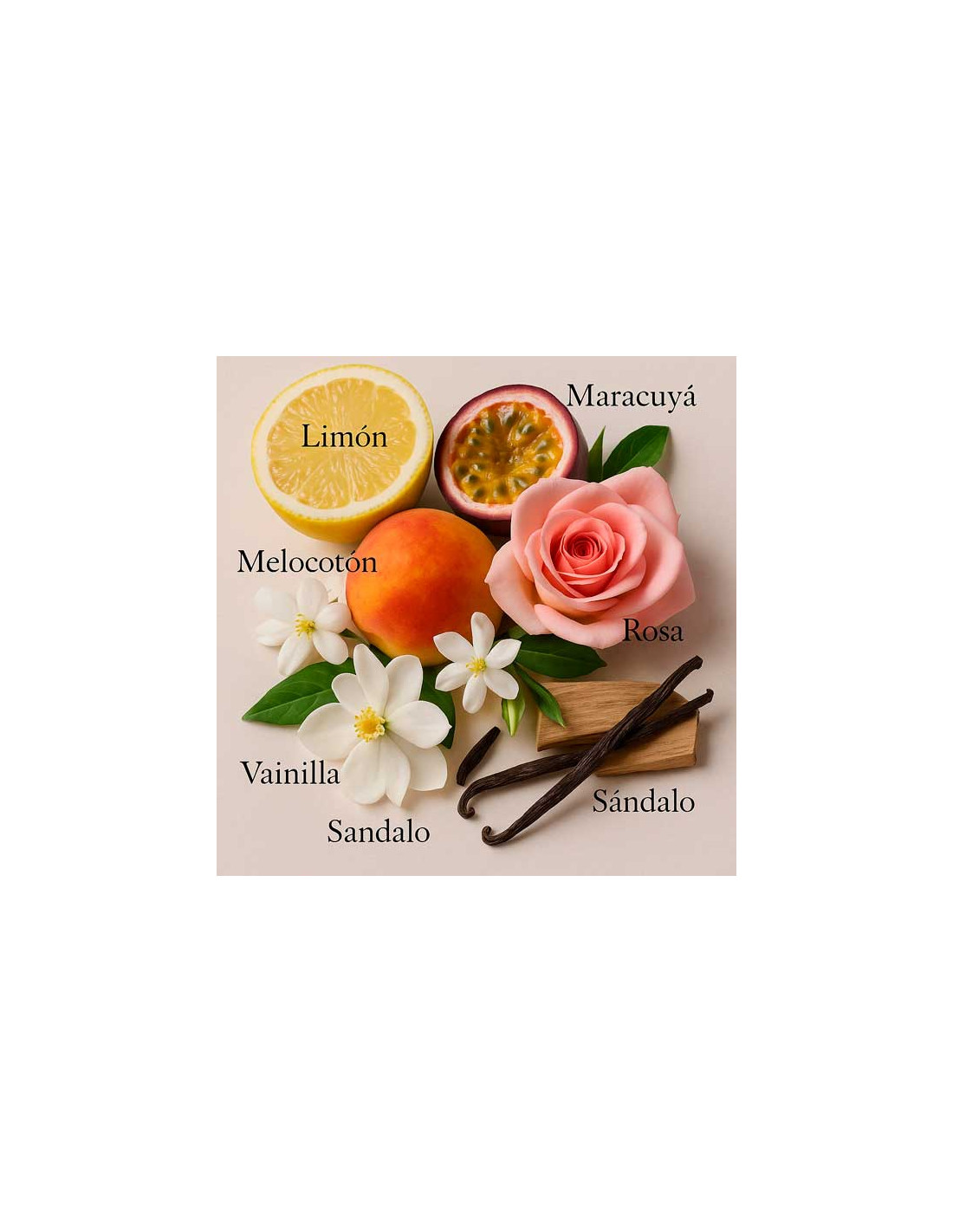 La fragància s’obre amb un acord afruitat de mandarina, bergamota i préssec. Al cor, sorgeix un bouquet floral suau i sofisticat format per gessamí, nenúfar i peònia. A la base, apareixen notes càlides i profundes de vainilla, sàndal, vetiver i ambre, que embolcallen la pell amb sensualitat duradora i elegància atemporal.