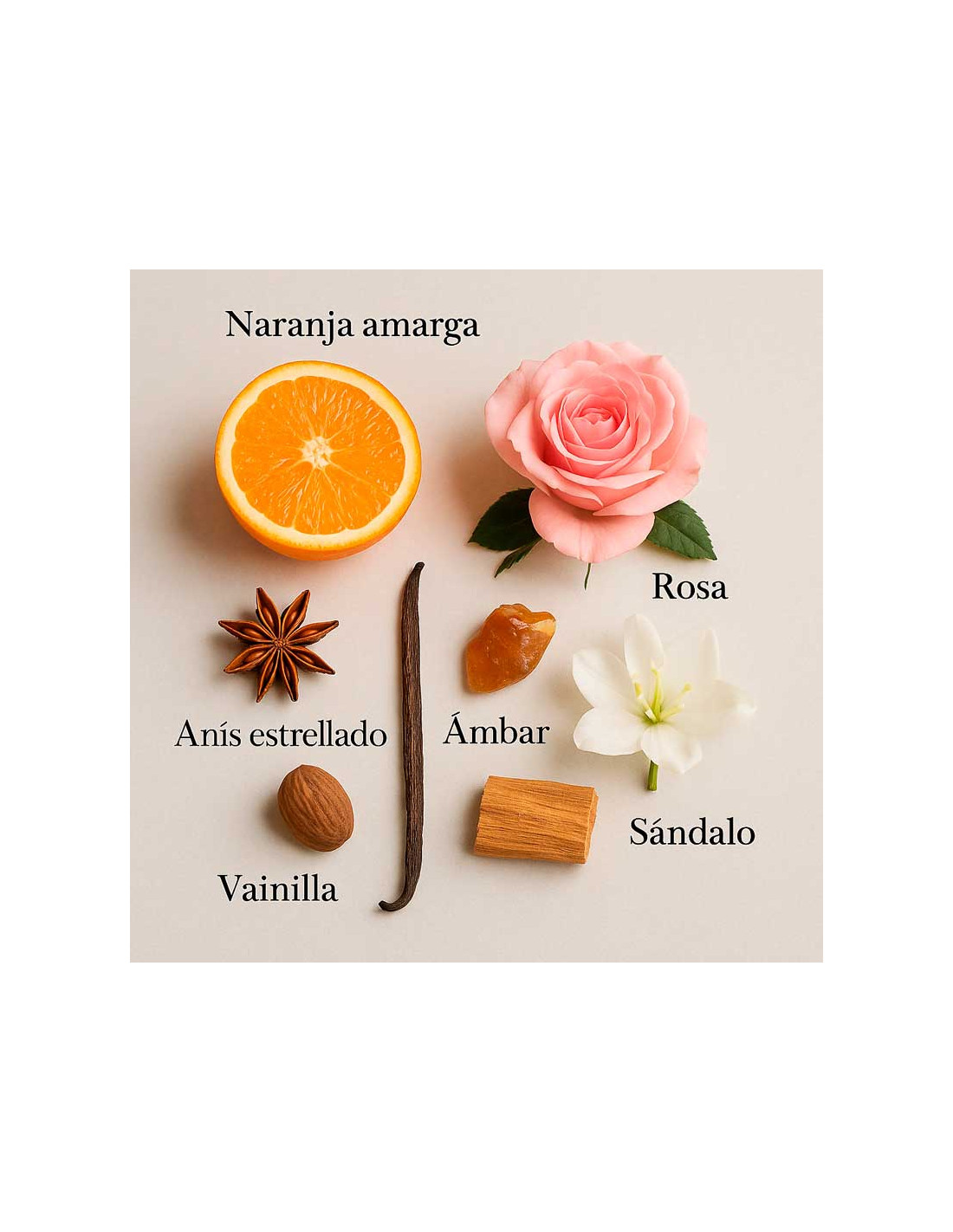 La fragància s’obre amb notes de flor de taronger, mandarina i anís estrellat, que aporten un toc fresc, espurnejant i lleugerament picant. Al cor, un elegant bouquet floral d’iris, orquídia i ylang-ylang embolcalla la pell amb un halo profundament femení i sensual.