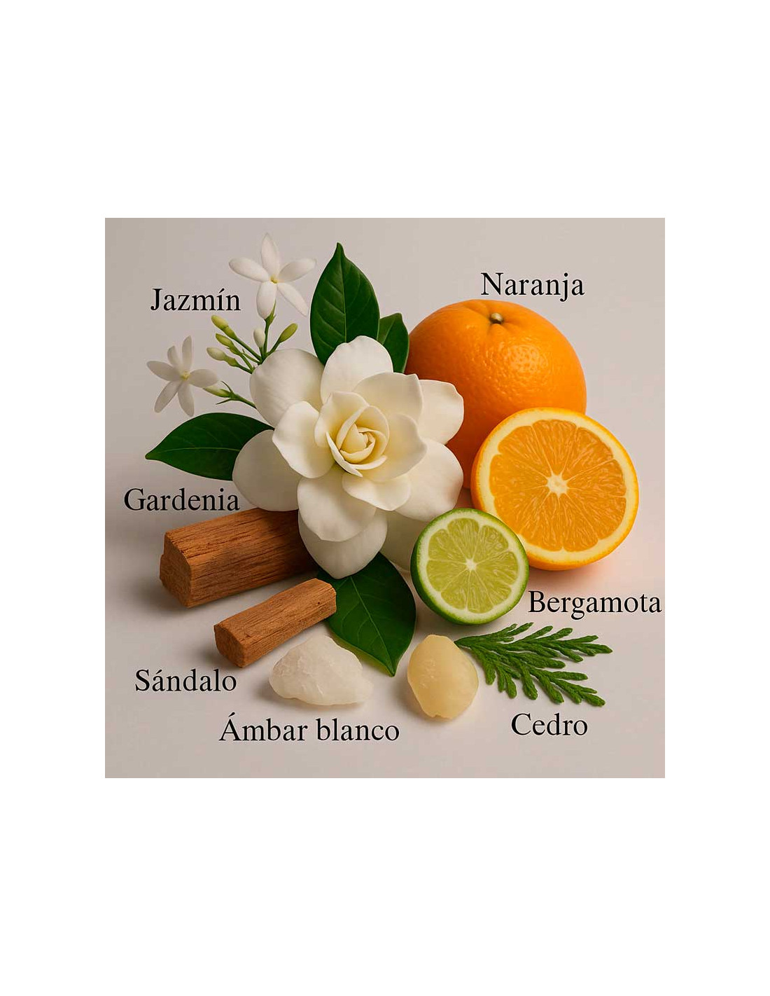 La sortida, amb un toc de taronja amarga i mandarina, aporta frescor i un caràcter cítric vibrant. Al cor, una exquisida mescla de gessamí, flor de taronger i gardènia afegeix feminitat i elegància. El fons esdevé empolsat i ambarí, amb un desplegament envoltant de fustes, ambre i absolut de fava de cacau, deixant una estela profunda i addictiva.