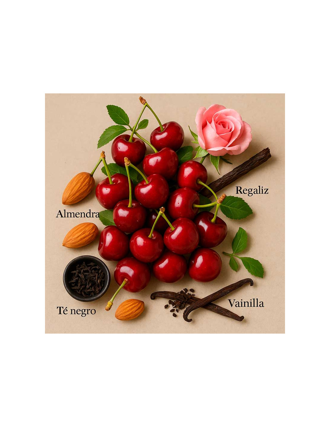 La sortida de gessamí i notes verdes crea una aroma fresca, com un passeig per un jardí florit. Al cor, una mescla de cirera àcida, te i ametlla aporta una nota dolça i elegant. Finalment, el fons de fava tonka, patchouli i vainilla deixa una estela seductora i acollidora, com una abraçada càlida en una nit d’hivern.