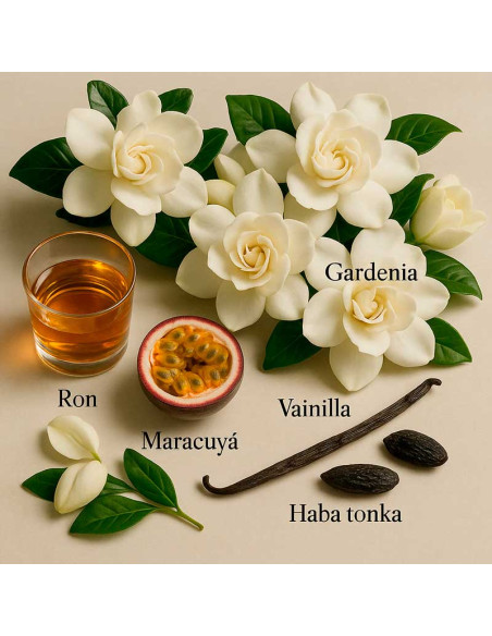 Les notes de sortida de fruita de la passió i rom aporten una dolçor tropical i exòtica. Al cor, una elegant combinació d’almizcle, gardènia i ametlla amarga afegeix un caràcter floral i ametllat molt refinat. El fons de fava tonka i vainilla crea una estela sensual i addictiva que embolcalla la pell amb una aura càlida i seductora.