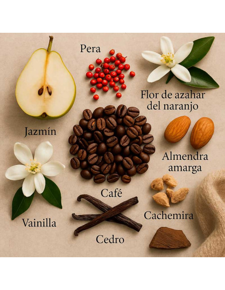 Les notes de sortida, amb un toc de pebre rosa i flor de taronger, creen una obertura vibrant i inoblidable. Al cor, la combinació única de cafè negre i gessamí sambac aporta una faceta addictiva i seductora. El fons de vainilla, patchouli i cedre arrodoneix la fragància amb una calidesa intensa i envoltant.