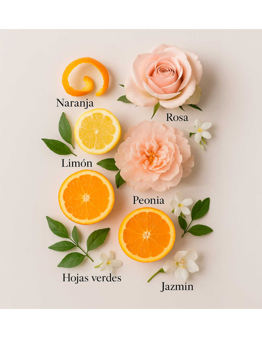 A la sortida, la frescor del llimona de Sicília i la bergamota de Calàbria es combina amb la dolçor delicada de la rosa de Grasse, creant una obertura brillant i femenina. El cor es construeix al voltant de la peònia, evocant la imatge d’un jardí en plena floració. El fons, format al voltant de l’almizcle blanc, arrodoneix la composició amb una estela neta, suau i elegant.
