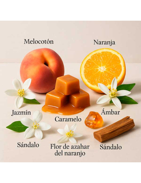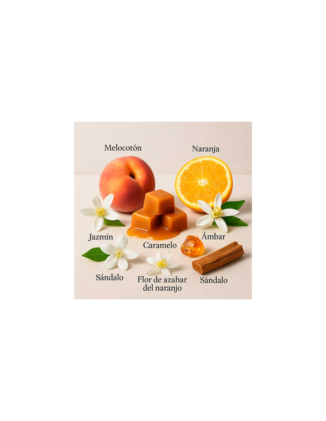 La sortida combina un acord de mandarina i taronja amarga amb un pessic de préssec, creant una sensació sucosa i lluminosa. Al cor, la fragància es torna més seductora amb gessamí i azahar, complementats pel toc refinat de la flor de taronger. Al fons, la barreja de caramel, sàndal, fusta de guaiac i vainilla crea una estela reconfortant i addictiva que evoca records d’infància.