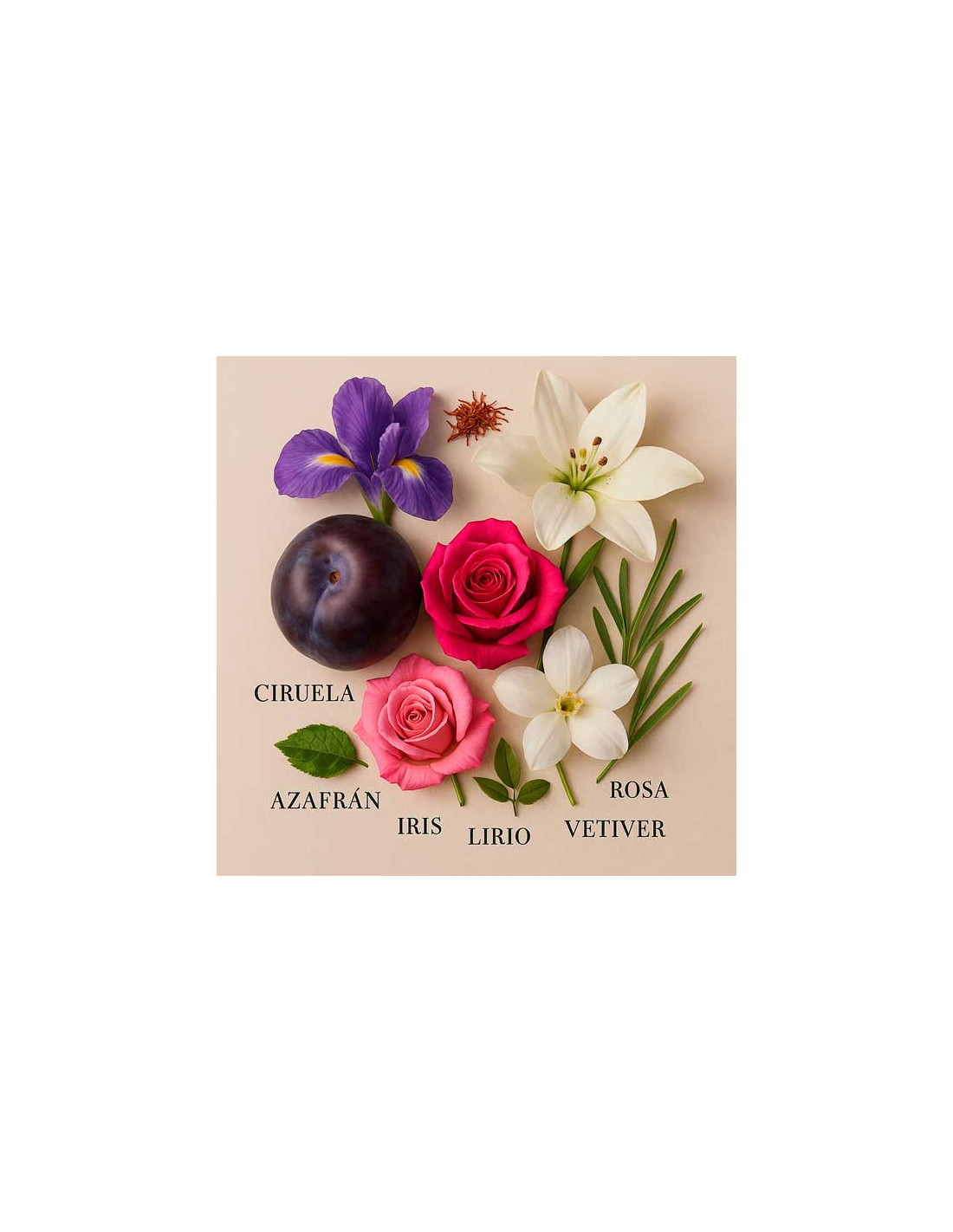 La sortida combina pruna, safrà i iris, creant un elixir refinat i ple de caràcter. Al cor, la rosa búlgara es fon amb matisos cremosos de gessamí sambac i arrel de lliri, donant lloc a una estela seductora i profundament sofisticada. El fons revela notes d’ambre, vetiver i la calidesa de la fusta de papir egipci, aportant profunditat i distinció.