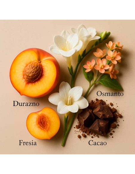 La seva aroma és dolça, aterciopelada i envoltant. La sortida apareix espurnejant gràcies al préssec melós i a les notes de frèsia. Aquesta entrada afruitada evoluciona ràpidament cap a un cor floral i exòtic d’osmanthus, una aroma exquisida i molt femenina. El fons es vesteix de cacau torrat, que aporta un punt subtilment dolç i addictiu.