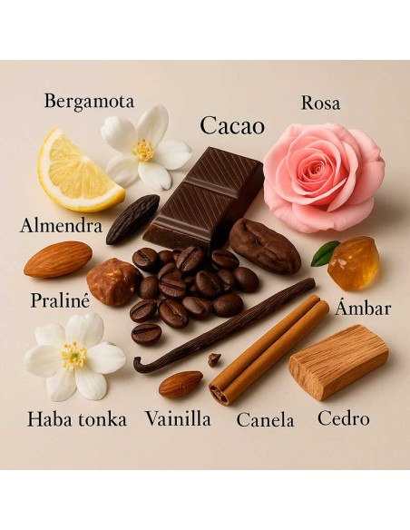 Les seves notes d’ametlla i cafè aporten un toc gourmand i sensual, com unes postres exquisides que envolten la pell en un núvol de dolçor i misteri. El fons amaderat de cedre i cacau afegeix elegància i sofisticació, deixant una estela càlida i addictiva.