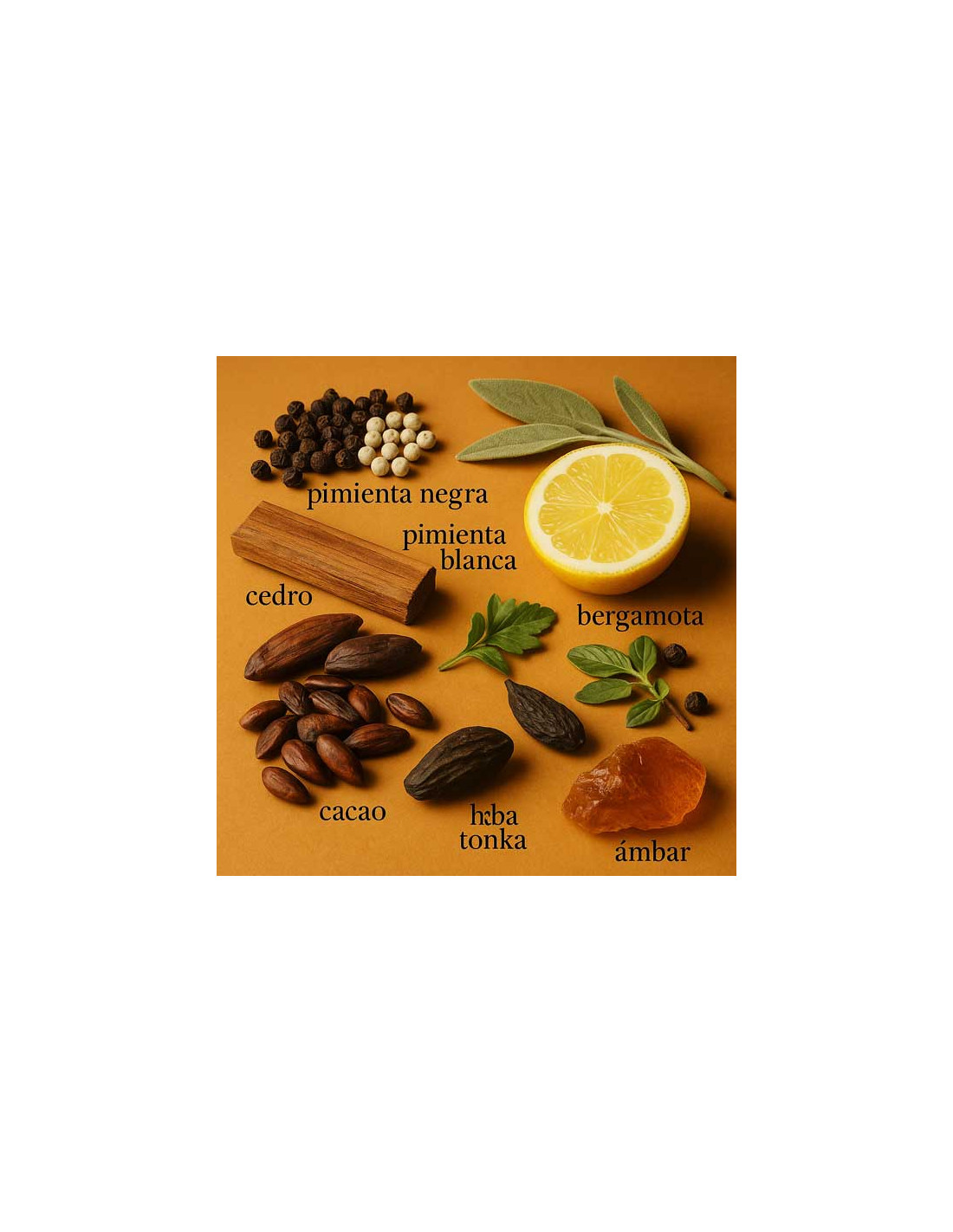 La rebel·lia del nou home. Fragància masculina, intensa i seductora que combina notes cítriques, enfustades i notes de pebre negre.