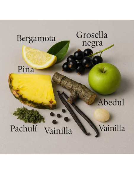 Les notes de sortida de pinya sucosa, bergamota i poma aporten una frescor vibrant i sucosa, mentre que el cor de la fragància amb rosa, gessamí i pachulí afegeixen un toc de calidesa i elegància. La base de la fragància és intensament masculina, amb notes de vainilla, molsa de roure i ambre gris.