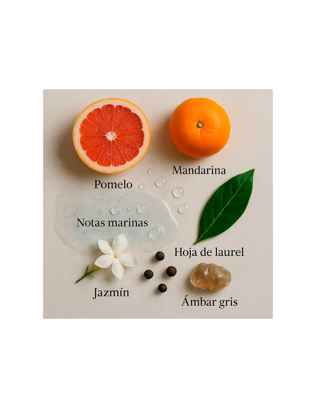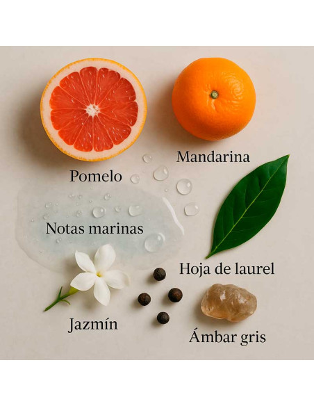 In the top notes, the fragrance features a strong aroma of fresh grapefruit and bay leaves , giving the fragrance its distinctive and uplifting character. At the heart of the fragrance are marine notes, adding a refreshing, aquatic touch to the composition.