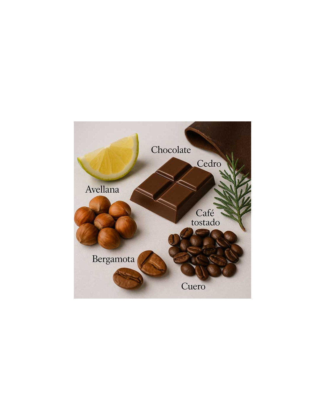 Top notes of bergamot and myrtle blend with a heart of coffee and hazelnut cream , while the base of cedar and leather give it an earthy, woody feel.
