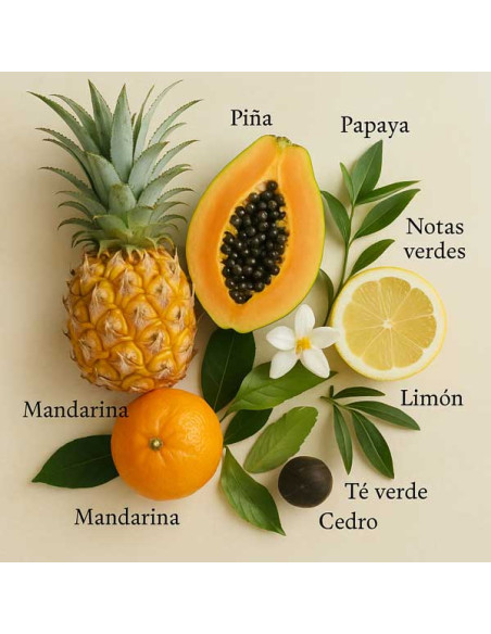 The top notes of the fragrance include pineapple and bergamot, which provide a feeling of freshness and energy. Furthermore, the fragrance features a special note of green tea, which adds a refreshing and natural touch to the fragrance.