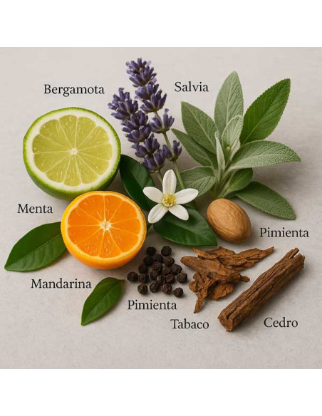 The top notes include a mix of bergamot and mandarin orange, which provide a feeling of freshness and vitality. In addition, neroli is added, a floral citrus note that provides a soft and delicate touch. At the heart of the fragrance are floral notes of lavender and sage, bringing a sense of elegance and sophistication. Finally, the fragrance settles on a base of woods, tobacco and tonka bean, which provides a feeling of depth and masculinity.