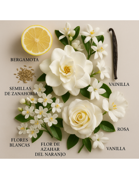 In the first minutes, bergamot brings sparkle and energy, while carrot seed adds a subtle earthy, sophisticated nuance. The heart unfolds into an elegant floral bouquet of Turkish rose, jasmine, orange blossom and white flowers, radiant and embracing. Finally, the resins of benzoin and labdanum blend with vanilla to create a warm, creamy and long-lasting trail that lingers for hours.