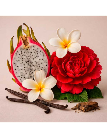 Boom is a burst of vitality centered on the unexpected seduction of pitaya (dragon fruit). Its sparkling opening releases the juicy, tropical freshness of this dragon fruit—vibrant and luminous—setting the fragrance’s unique character from the very first moment. At the heart, the velvety sweetness of cherry melts into the floral softness of peony and the exotic allure of red frangipani, wrapping the fruity note in an intoxicating, feminine halo. The fragrance settles into a golden base of vanilla with hints of patchouli, warm and comforting.