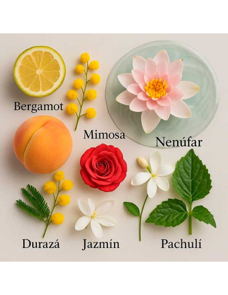 The opening blends mandarin, peach and bergamot, adding a fresh, juicy and sweet touch. Aquatic florals such as waterlily blend with orange blossom and mimosa, creating a soft, airy and feminine heart. In the base, the fragrance becomes warmer and more sensual with sandalwood, patchouli, vanilla and tonka bean.