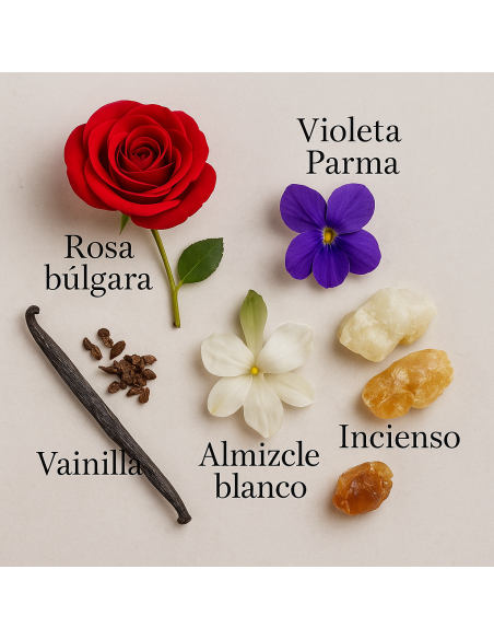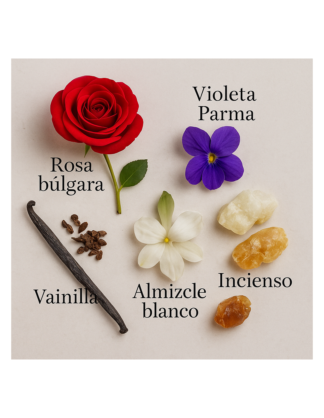 Top notes of Bulgarian rose and blackcurrant bring freshness and vitality. At the heart, jasmine and violet add delicacy and romance. The base of vanilla and powdery incense leaves a soft, enveloping trail.