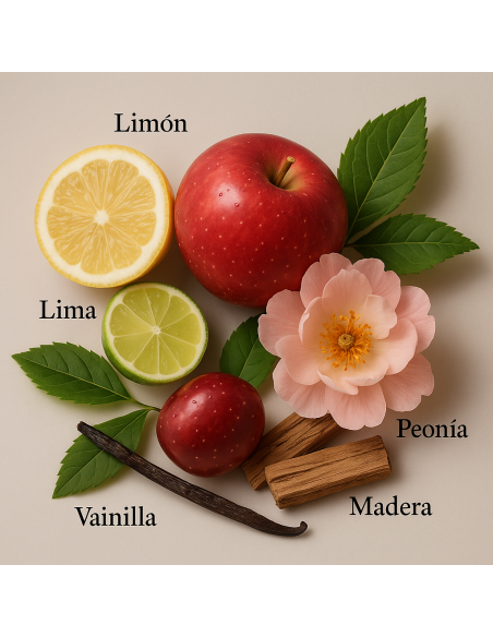 The bright opening of Sicilian lemon and lime delivers an immediate feeling of freshness and vitality. At the heart, the blend of red apple and peony adds femininity and elegance. The base unfolds with a soft and enveloping note of praline, vanilla and cedarwood.