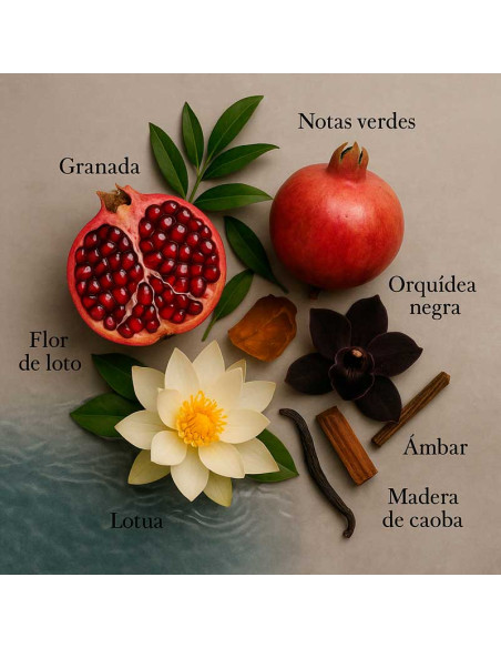 The opening, with a blend of pomegranate, persimmon and green notes, delivers a fresh and juicy touch. At the heart, a fusion of black orchid, lotus and champaca flowers adds exoticism and mystery. In the base, black violet unfolds, wrapped in liquid amber and mahogany, leaving a deep and seductive trail.