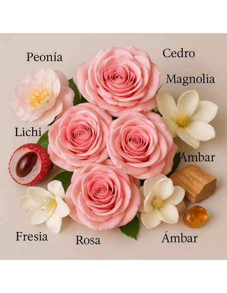 The opening unfolds with a floral bouquet of peony, lily of the valley, freesia and rose, brightened by fruity touches of lychee. At the heart, a blend of rose, magnolia and lily of the valley adds elegance and femininity. Finally, the fragrance evolves into a woody and musky trail that wraps the skin in a sensual and delicate note.