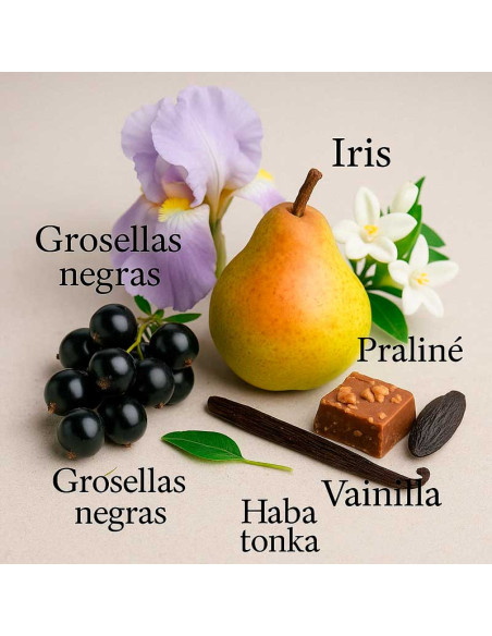The joyful, sparkling opening blends fruits such as blackcurrant and pear. At the heart, elegant notes of iris, jasmine and orange blossom unfold. The base is oriental and gourmand, with an irresistible mix of vanilla, praline, tonka bean and patchouli, leaving a warm and addictive trail.