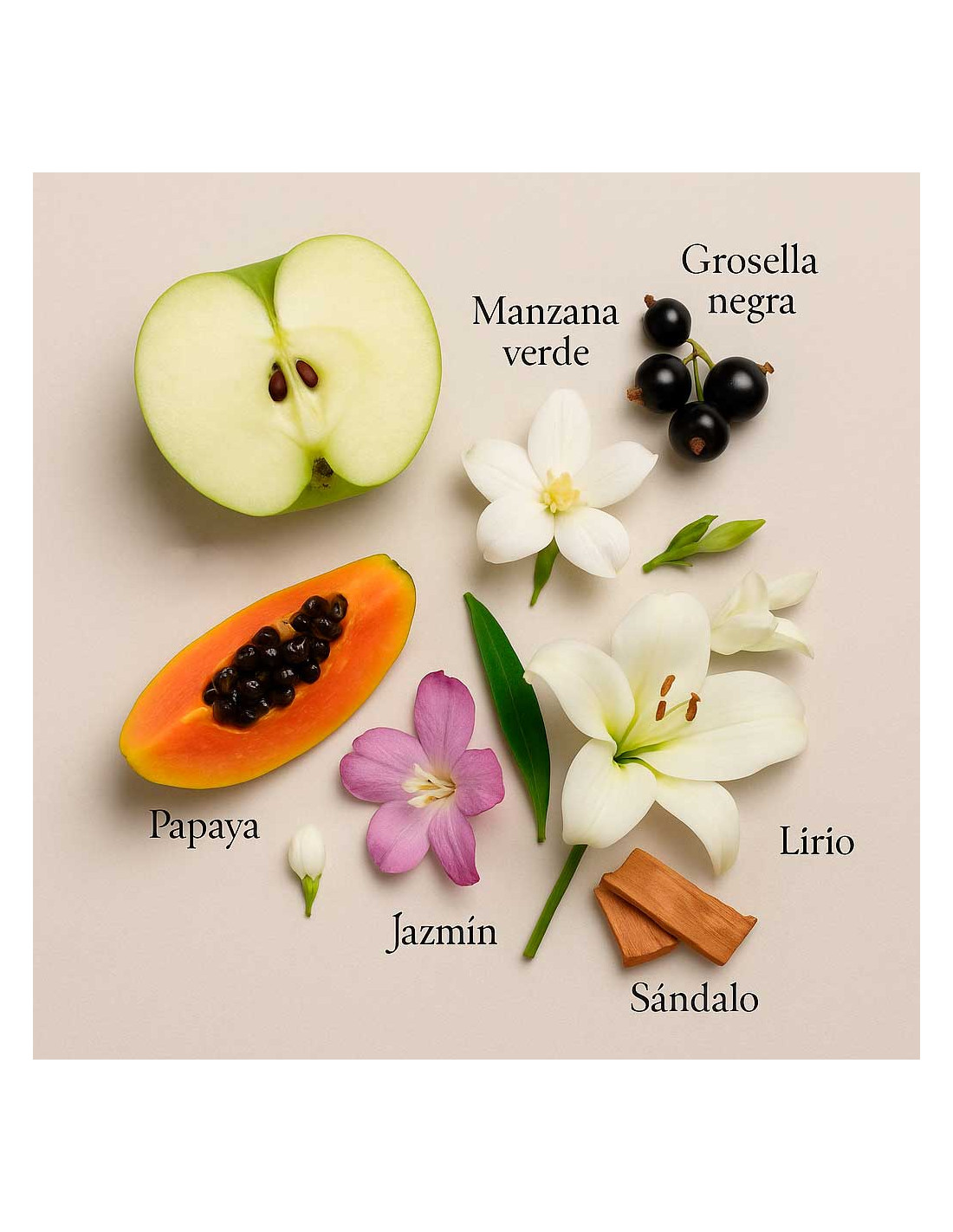 The heart blends white flowers, jasmine and a touch of plum, creating a soft, feminine and well-balanced floral character. The base reveals warmth and depth thanks to notes of sandalwood, cedar and amber.