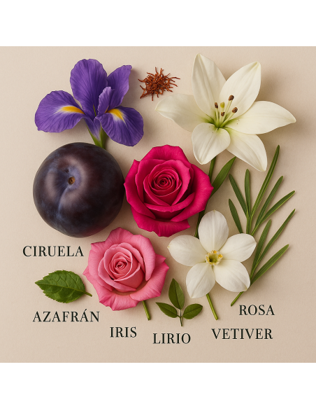 The opening blends plum, saffron, and iris, creating a refined elixir full of character. In the heart, Bulgarian rose melts into creamy nuances of sambac jasmine and orris root, creating a seductive, deeply sophisticated trail. The base reveals notes of amber, vetiver, and the warmth of Egyptian papyrus wood, adding depth and distinction.
