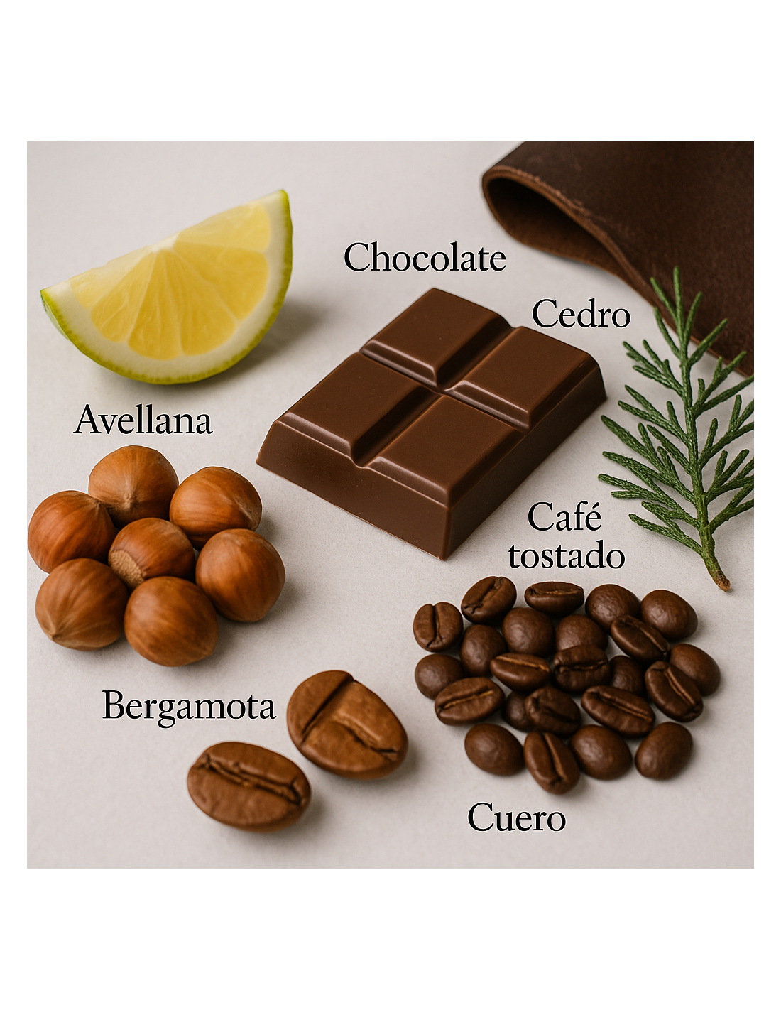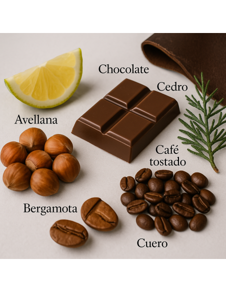 Las notas de salida de bergamota y mirto se mezclan con un corazón de café y crema de avellana, mientras que la base de cedro y cuero le da una sensación terrosa y leñosa.