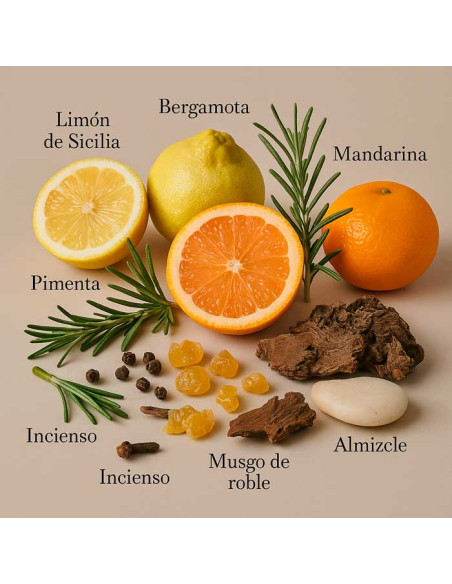 Las notas de salida de mandarina siciliana y toronja fresca se combinan con la nota de pimienta rosa picante para crear una primera impresión de vitalidad y fuerza. Las notas de corazón de enebro y palo de rosa le añaden un toque herbal y aromático, mientras que las notas de base de almizcle y musgo de roble crean una sensación de calidez y profundidad.