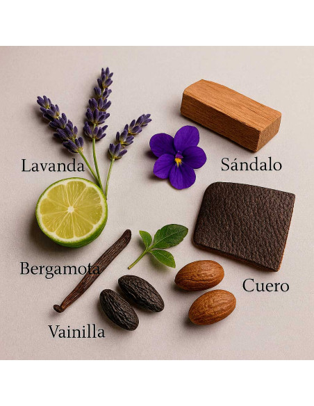 La fragancia se desarrolla con el tiempo, revelando tonos cálidos y suaves de cuero, haba tonka y sándalo, que se combinan con la frescura del clavel y la lavanda, creando una sensación de equilibrio y armonía.