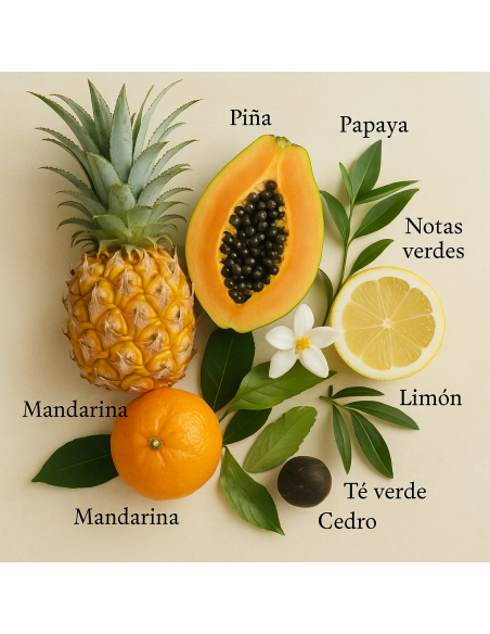 La salida combina la energía de la piña y la bergamota, aportando una sensación fresca y chispeante. La nota de té verde añade un matiz refrescante, ligero y natural que hace la fragancia aún más especial.