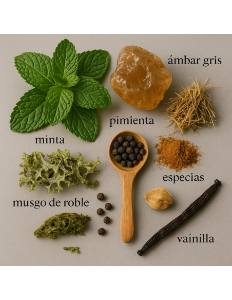Las notas de salida incluyen una mezcla de menta fresca y ámbar, que se funden en un corazón de pimienta, vetiver y especias. Estas notas picantes aportan una sensación de ligereza, que se complementa con la intensidad y profundidad de las notas de fondo, como el musgo de robre y la vainilla.