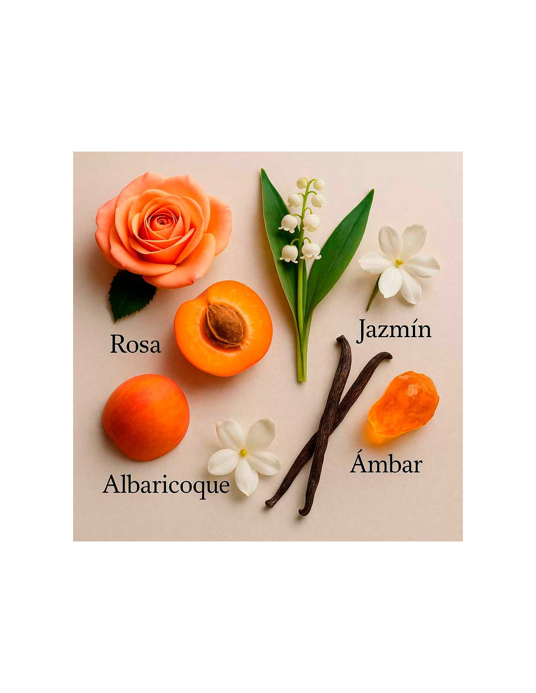 Las notas de salida afrutadas combinan piel de melocotón y albaricoque, aportando suavidad y calidez inicial. En el corazón, surge un bouquet de jazmín, rosa y lirio del valle, que añade un toque refinado y sofisticado. En la base, la fragancia se intensifica con notas de sándalo, vainilla y almizcle, logrando un cierre cálido, sensual y duradero.