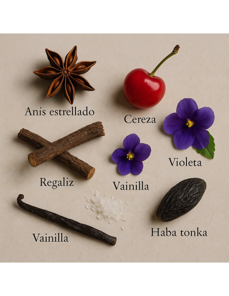 La fragancia se abre con una mezcla original de regaliz, anís estrellado y bayas de hiedra, que aportan un acorde dulce, ligeramente especiado y misterioso. En el corazón, una delicada combinación de violeta, iris y amarilis dibuja un carácter floral suave y femenino. En la base, el perfume se vuelve más cálido y goloso con notas de vainilla, almendra y praliné, creando una estela adictiva y envolvente.