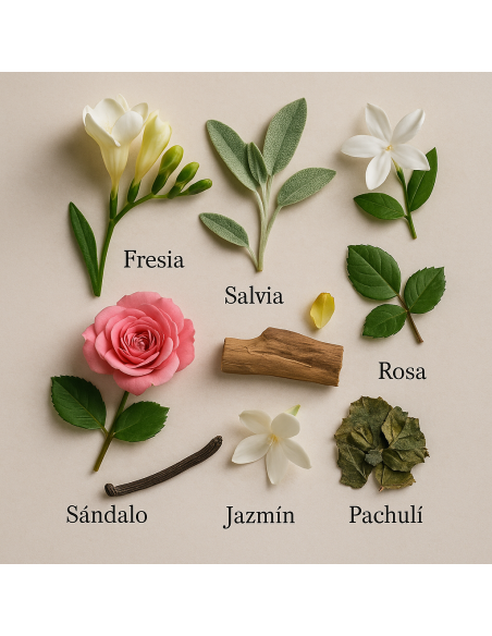 La fragancia se abre con un acorde chispeante de mandarina, fresia y salvia, que aporta vivacidad, frescor y una sensación luminosa desde el primer instante. En el corazón florece una mezcla delicada de lirio, clavel, violeta y rosa, creando un bouquet femenino, suave y equilibrado.