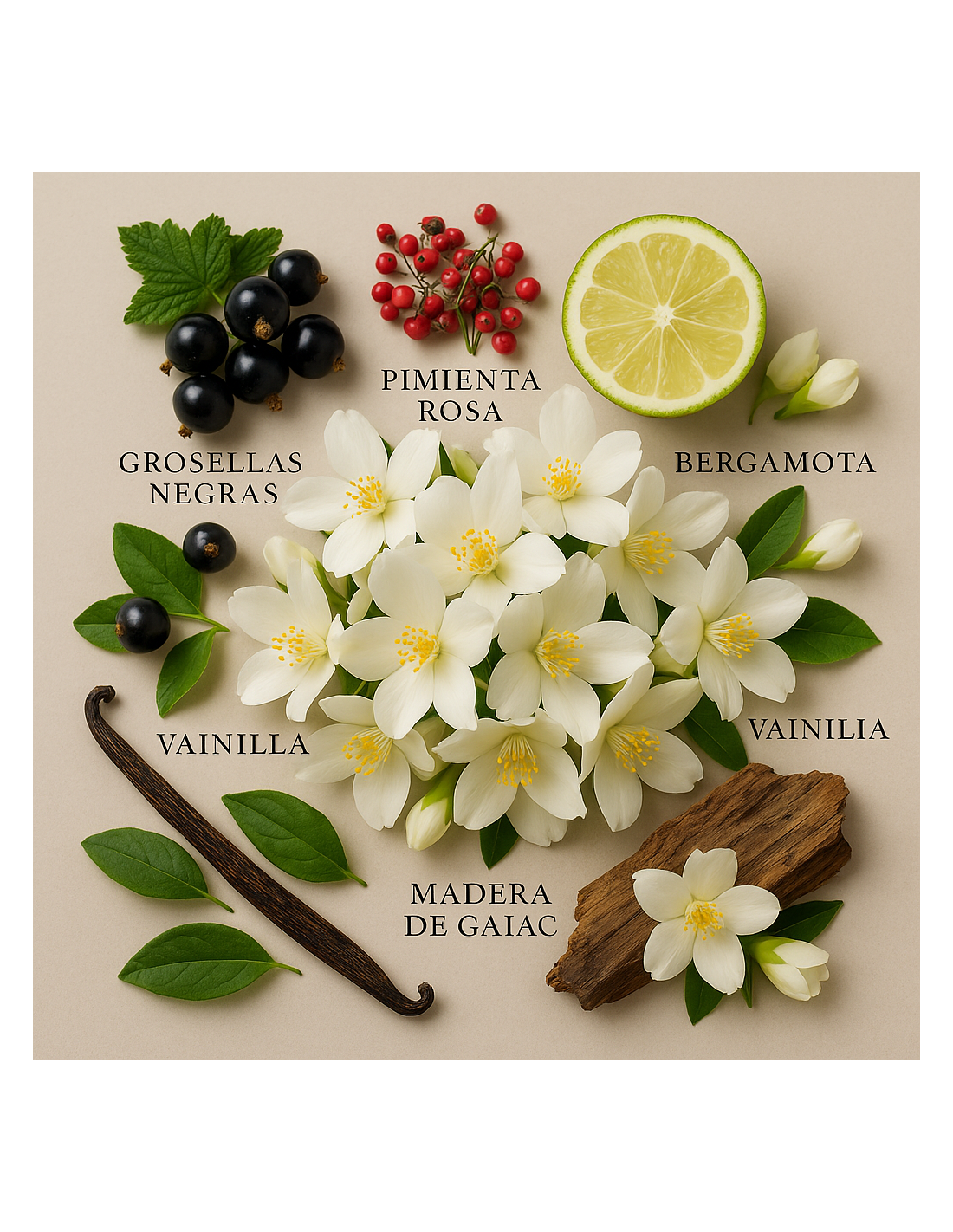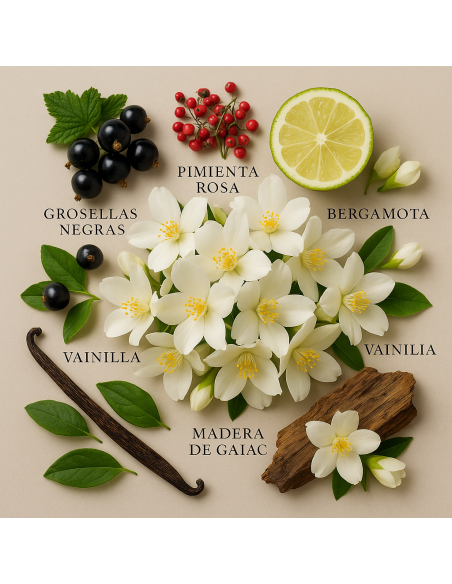 Fondo: vainilla Bourbon, cashmere, madera de gaiac.