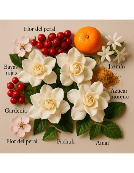 En el fondo, el pachulí aporta una profundidad terrosa, elegante y ligeramente misteriosa, suavemente endulzada por el acorde de azúcar moreno, que envuelve la fragancia en una estela dulce, envolvente y sofisticada. El resultado es un perfume que equilibra de forma magistral lo floral blanco, lo afrutado y lo gourmand.