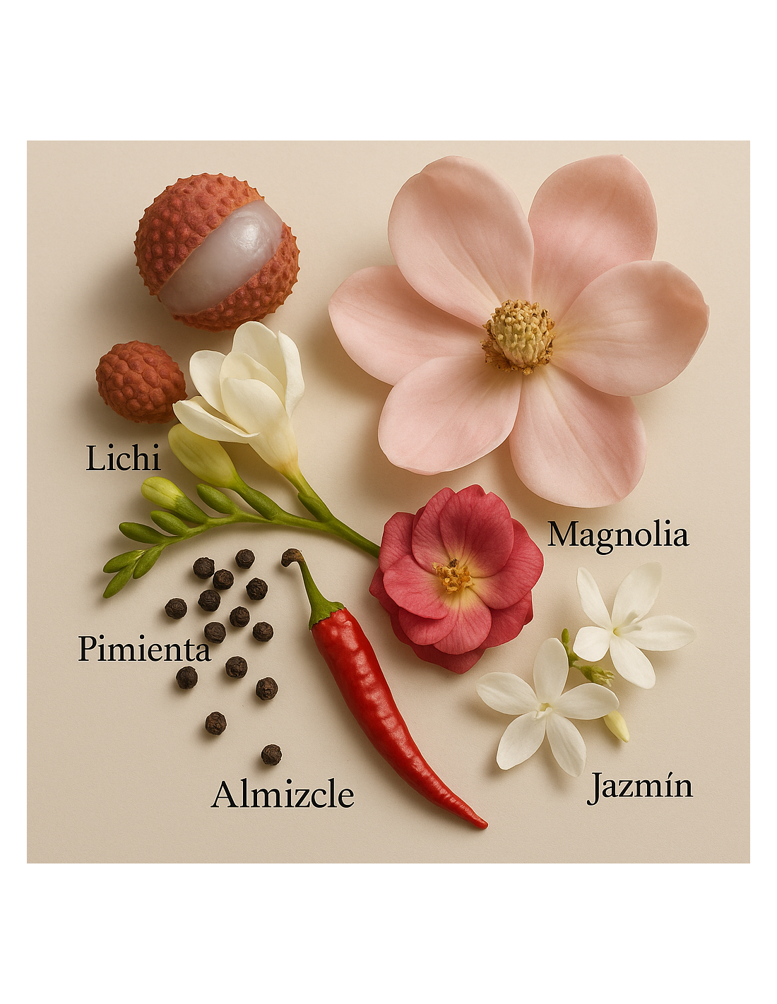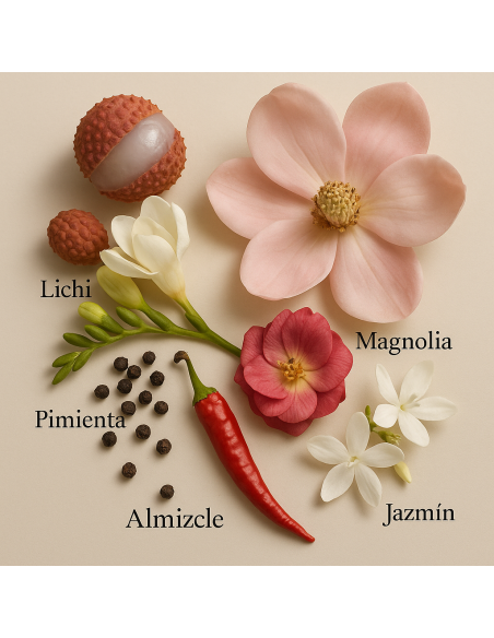 La fragancia se inicia con una explosión de notas frescas y afrutadas de lichi y frutas de la pasión, que le aportan un toque exótico, jugoso y alegre. En el corazón, la rosa y la magnolia se fusionan para crear un acorde floral intenso y suave, que se complementa con jazmín, peonía y matices especiados de jengibre, aportando dinamismo y sofisticación.