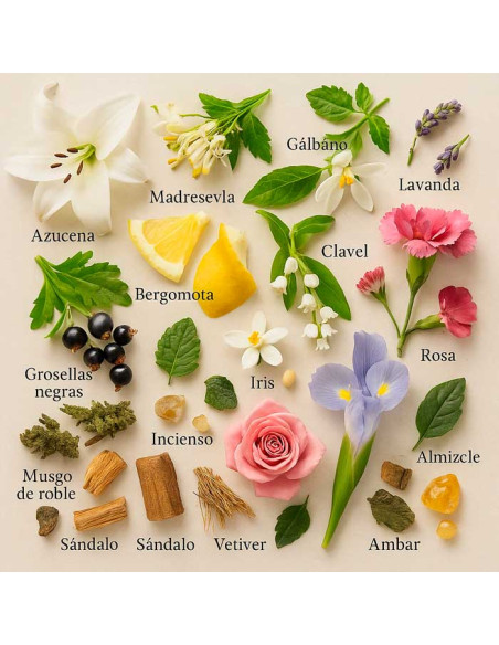 Corazón: vetiver, iris de Florencia, acordes florales suaves.