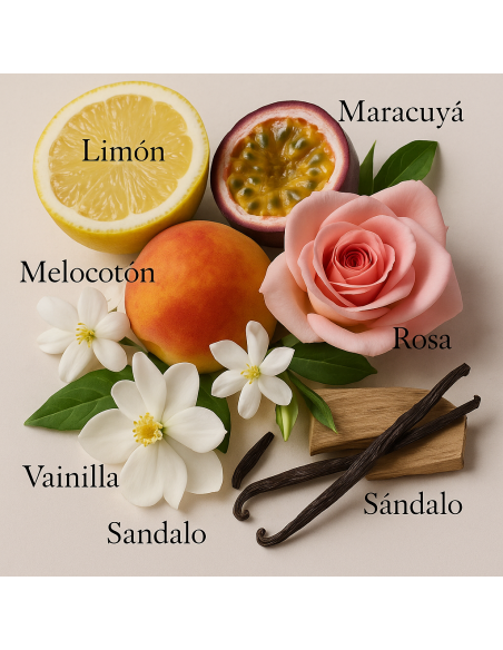 La fragancia se abre con un acorde afrutado de mandarina, bergamota y melocotón. En el corazón surge un bouquet floral suave y sofisticado formado por jazmín, nenúfar y peonía. En la base, aparecen notas cálidas y profundas de vainilla, sándalo, vetiver y ámbar, que envuelven la piel con sensualidad duradera y elegancia atemporal.