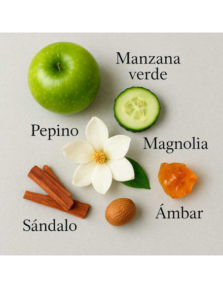 La magnolia ofrece una transición suave hacia un corazón florido de rosa y violeta, que equilibra frescura y feminidad con una elegancia delicada. Finalmente, en la base, aparecen notas amaderadas y ámbar, que envuelven la piel con una sensación cálida, confortable y ligeramente sofisticada.