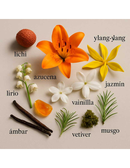 El comienzo es luminoso y vibrante, con una mezcla de mandarina, melocotón y lichi que aporta frescura y vitalidad. En el corazón, se unen la azucena, el muguete y el jazmín, acompañados de un delicado toque de ciruela. El fondo, con vainilla, ámbar y madera de cedro, aporta una calidez sensual y envolvente que deja una estela adictiva y seductora.