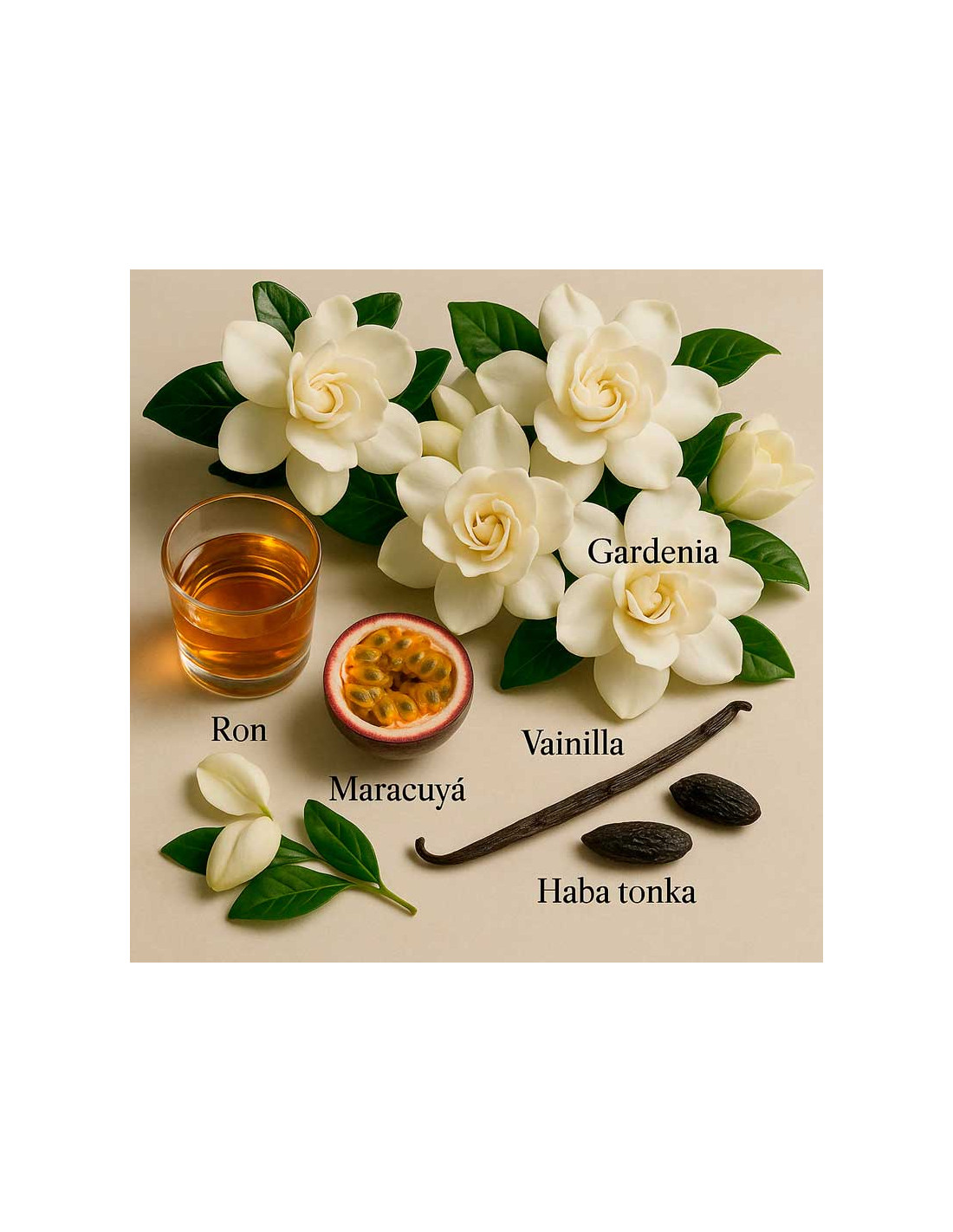 Las notas de salida de maracuyá y ron aportan una dulzura tropical y exótica. En el corazón, una elegante combinación de almizcle, gardenia y almendra amarga añade un carácter floral y almendrado muy refinado. El fondo de haba tonka y vainilla crea una estela sensual y adictiva que envuelve la piel con un aura cálida y seductora.