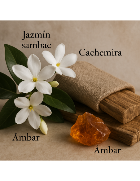 La salida de jazmín sambac crea un comienzo floral y dulce. En el corazón, el ámbar blanco y las notas amaderadas aportan un toque cálido y seductor. Las notas de fondo ambarinas completan la fragancia con una profundidad envolvente que la hace ideal para ocasiones especiales.