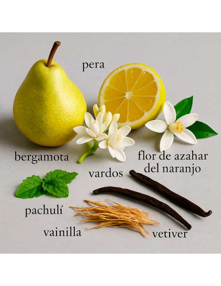 Las notas de salida, con un toque de flor de azahar y jazmín, aportan una sensación fresca y luminosa con matices afrutados. En el corazón, una mezcla de vetiver, nardo y tuberosa añade carácter, feminidad y sofisticación. La fragancia concluye con un fondo envolvente de almizcle, sándalo de Mysore y pachulí, dejando una estela intensa y elegante.