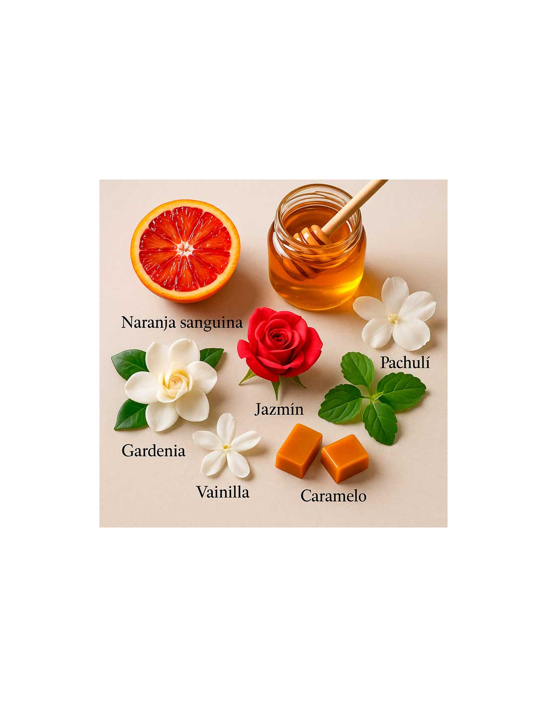 La fragancia se abre con una mezcla chispeante de bergamota, mandarina y naranja sanguina, que aporta frescor y vitalidad. En el corazón, la miel toma el protagonismo y, junto con la gardenia, compone una esencia balsámica, dulce y cremosa. En la base, el perfume se vuelve más cálido y sensual con notas de pachulí, cera de abeja y haba tonka, dejando una estela adictiva y envolvente sobre la piel.